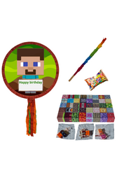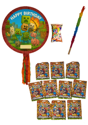 Dimensiuni aproximative de 60 de cm(cu franjuri) pe 33 cm(diametru). Capacitate de umplere aproximativ 8-10 litri. Rezista, cu o sarcina indicata de maxim 2 kg a umpluturii, la aproximativ 30 de lovituri a unui copil de 7-10 ani. Pentru a se sparge mai repede(in cazul copiilor mai mici ) este indicat sa perforati zona inferioara a pinatei! Bat din lemn si confetti cadou! Confectionate din materiale ecologice: hartie, carton si hartie creponata certificata TUV. Confectionata din dragoste pentru copii! Umplutura nu este inclusa! Se adauga ulterior de catre d-vstra prin orificiul mascat. Setul include: - 1 pinata - 10 figurine mineworld - 1 bat - 1 punga confetti multicolor Atentie!Pinata nu include si umplutura cu dulciuri