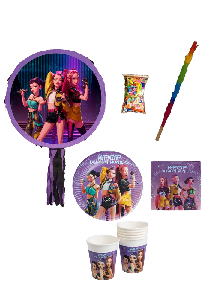 Setul include: - 1 pinata - 1 bat din lemn - 1 punga de confetti - 6 farfurii - 6 pahare - 6 servetele